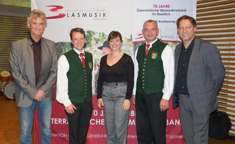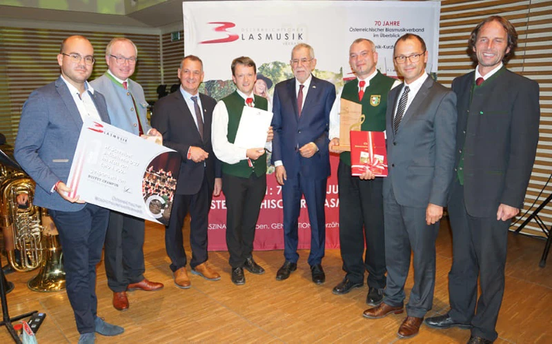 Vertreter der Firma Buffet Crampon, Landeshauptfrau-Stellvertreter Stephan Pernkopf, Präsident Erich Riegler, Kapellmeister MMag Stephan Kaufmann, Bundespräsident Alexander van der Bellen, Obmann Markus Plaschg, Bundeskapellmeister Helmut Schmid, Landeskapellmeister Manfred Rechberger.